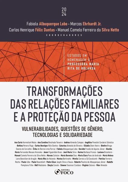 Sobre a obra Transformações das Relações Familiares e a Proteção da Pessoa 1ª Ed - 2024 Vulnerabilidades, Questões de Gênero, Tecnologias e Solidariedade PARTE 1 PESSOA E VULNERABILIDADE Nova principiologia do direito de família A atualidade da interpretação constitucional no direito de família Proteção da pessoa idosa nas relações de família Exercício da capacidade civil de filhos surdos advindos de famílias ouvintes Divórcio impositivo, a desjudicialização do divórcio como direito potestativo Poder familiar na perspectiva do direito civil-constitucional e a necessária interferência da sociedade e do estado para o melhor interesse de crianças e adolescentes PARTE 2 VIOLÊNCIA E RELAÇÕES DE GÊNERO A trajetória da mulher e os seus reflexos no direito das famílias Reflexões sobre o discurso jurídico androcêntrico da guarda compartilhada Nem só de cama vive a mulher: o não reconhecimento das famílias simultâneas é um problema de gênero Estupro marital: violência sexual como exercício do biopoder no casamento Análise crítica do discurso jurídico (ACDJ): o caso da denúncia de estupro PARTE 3 FILIAÇÃO, AUTONOMIA PARENTAL E BIOTECNOLOGIA A possibilidade de caracterização de multiparentalidade por meio da inseminação caseira A posse de estado de filho além da filiação socioafetiva: a preexistente atuação como meio de prova O "abismo" normativo no trato das famílias ectogenéticas: a insuficiência do art. 1597 (incisos iii, iv e v) em matéria de reprodução humana assistida homóloga e heteróloga PARTE 4 IMPACTOS DA TECNOLOGIA NA FAMÍLIA Responsabilidade pelo vazamento de dados de crianças e adolescentes Notas sobre a ilegalidade da publicidade que fomenta a sexualização das crianças no brasil Minha família, minhas regras: da família contratual aos smart contracts de direito de família PARTE 5 SOLIDARIEDADE, PLANEJAMENTO E PROTEÇÃO PATRIMONIAL Parentalidade responsável e direito aos alimentos gravídicos: caminhos para a efetividade da lei 11.804/2008 Tributação da renda familiar: novos tempos, velhas regras Um novo fideicomisso: proposta de transformação do instituto em prol do planejamento sucessório Holding familiar como um dos instrumentos de planejamento patrimonial e sucessório: uma análise sobre os aspectos contemporâneos Constituição empresarial e dissolução familiar: interseções entre família e empresa Alimentos Compensatórios