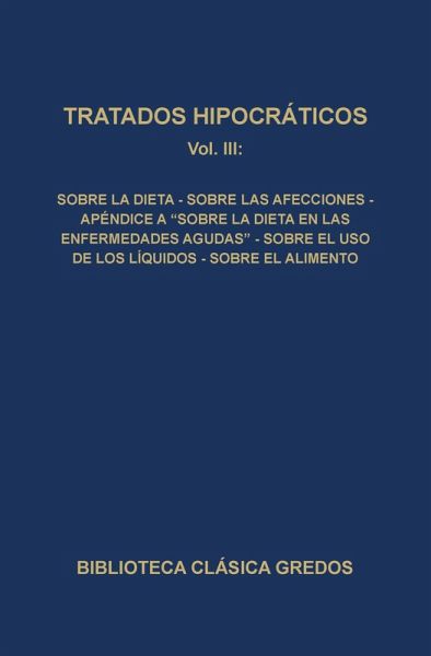 Este hito histórico de la filología clásica, la traducción íntegra de los Tratados hipocráticos, es una ocasión única no sólo para los interesados en el nacimiento y la evolución de la ciencia médica, sino para cualquier amante de la cultura griega. El Corpus Hippocraticum es un conjunto de más de cincuenta tratados médicos de enorme importancia, pues constituyen los textos fundacionales de la ciencia médica europea y forman la primera biblioteca científica de Occidente. Casi todos se remontan a finales del siglo V y comienzos del IV a.C., la época en que vivieron Hipócrates y sus discípulos directos. No sabemos cuántos de estos escritos son del "Padre de la Medicina", pero todos muestran una orientación coherente e ilustrada, racional y profesional, que bien puede deberse al maestro de Cos. Más importante que la debatida cuestión de la autoría es comprender el alcance de esta medicina, su empeño humanitario y su afán metódico. Este corpus resulta esencial no sólo para la historia de la ciencia médica, sino para el conocimiento cabal de la cultura griega. Éste es el primer intento de verter al castellano todos estos tratados, y se ha hecho con el mayor rigor filológico: se ha partido de las ediciones más recientes y contrastadas de los textos griegos, se han anotado las versiones a fin de aclarar cualquier dificultad científica o lingüística y se han añadido introducciones a cada uno de los tratados, con lo cual se incorpora una explicación pormenorizada a la Introducción General, que sitúa el conjunto de los escritos en su contexto histórico. El tercer volumen de los Tratados hipocráticos incluye los textos "Sobre la dieta", "Sobre las afecciones", "Apéndice a "Sobre la dieta en las enfermedades agudas"", "Sobre el uso de los líquidos" y "Sobre el alimento".