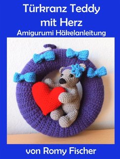 Ein herzliches Willkommen! Hier bist du gerne gesehen. Ich schenke dir mein Herz. So oder so ähnlich könnte die Botschaft des kleinen Teddys sein. Der Türkranz hat einen Durchmesser von 25cm, der Teddy selbst ca. 18cm (wenn er steht). Du benötigst folgende Kenntnisse: Luftmasche, feste Masche, Kettmasche, Stäbchen, in Runden und in Reihen häkeln, Maschen zunehmen und abnehmen Angaben zu Material sind in der Anleitung enthalten. Du benötigst in jedem Fall einen Styroporkranz 25cm Durchmesser, Häkelnadel 3,5, Wolle in lila, beige, rot und jeansblau und einen Rest in schwarz, sowie Sicherheitsaugen schwarz 10mm Durchmesser, Füllwatte, Schere, Wollnadel Viel Spaß beim Nacharbeiten ;-)