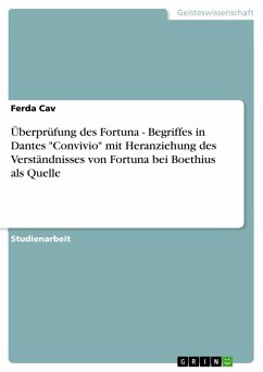 Studienarbeit aus dem Jahr 2006 im Fachbereich Philosophie - Sonstiges, Note: 1,7, Albert-Ludwigs-Universität Freiburg, Veranstaltung: Italienische Philosophie von Dante bis Bruno, Sprache: Deutsch, Abstract: Einführung in das Thema und Problemstellung Der Schicksalsbegriff beinhaltet Probleme, die einen wesentlichen Bestandteil der Philosophiegeschichte ausmachen. Wie entscheidet sich das Schicksal (Fortuna) einige Menschen in die Katastrophe zu stürzen, während andere unverdienterweise mit Reichtümern ausgestattet zum höchsten Ruhm gelangen? Was nützen einem der Gebrauch von Vernunft und Einsicht, wenn ein sittliches Handeln keine gerechte Strafe und Belohung erhält? Nimmt in einer durch die göttliche Vorsehung geordneten Welt, das Schicksal einen höheren Rang ein als die Ordnung Gottes? Oder ist Gott selbst ungerecht, indem er Menschen nach seinem Gutdünken bestraft oder belohnt ohne auf ihr Handeln näher einzugehen? Vor Dante Alighieri haben sich auch andere Philosophen mit diesem Problem befasst. Für Dantes Fortunabild waren dabei hauptsächlich die Quellen der christlichen Interpretationen von Augustinus und Boethius, die Lehren der großen Scholastiker Albertus Magnus und Thomas von Aquin maßgebend. Während Augustinus für die Schicksalsgöttin der Heiden keinen Raum in der christlichen Lehre sieht und die Fortuna in das Reich der Dämonen versetzt, verhalf Boethius in der Consolatio philosophiae der Gestalt der antiken Glücksgöttin zu frischem Leben um sie schließlich ganz in den Dienst Gottes zu stellen. Albertus Magnus und sein Schüler Thomas von Aquin gewinnen ihre Fortuna-Konzeption in der Auseinandersetzung mit Aristoteles und versuchen dabei eine Synthese zwischen christlicher Theologie und aristotelischer Metaphysik zu finden. Damit verschafften sie Dante den Zugang zu den philosophischen Systemen griechischer Tradition. Nicht nur aufgrund der Tatsache, dass das von Boethius erzeugte ambivalente Bild einer christlichen Fortuna zur Grundlage für den mittelalterlichen Fortuna-Begriff wurde, sondern vor allem auch, weil sich Dante in seiner Diskussion auf die philosophische Quelle des Boethius beruft und einige Aspekte seiner Argumentation mit ihm teilt , soll in dieser Arbeit die Herangehensweisen an das Problem der Fortuna dieser beiden Autoren auf ihre gegenseitige Beziehung überprüft werden.