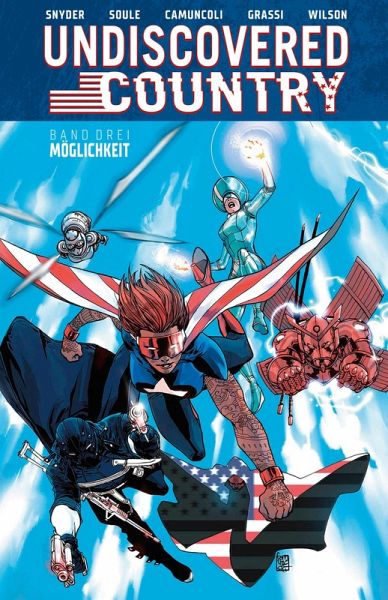 Das Land der unbegrenzten Möglichkeiten Der wilde Ritt durch die verdrehte Version der Vereinigten Staaten geht weiter! Unsere Gruppe von Abenteurern wagt sich in die dritte Zone vor: MÖGLICHKEIT. Diese Region mit dem schier endlosen Potenzial zur Entwicklung fußt auf den größten Errungenschaften der amerikanischen Kreativität. Für den Kulturexperten Ace hat die große Stunde geschlagen. Sein Wissen ist nun entscheidend für das Überleben an diesem Ort, an dem wirklich alles möglich zu sein scheint - vom großen Schrecken bis hin zu großer Überlegenheit ... Ladies and Gentlemen, bitte nehmen Sie Platz. Der heutige Redner wird gleich die zweifellos wichtigste Rede halten, die je verfasst worden ist. Also schenken Sie ihm bitte Ihre volle Aufmerksamkeit - heute spricht für Sie: Ace Kenyatta. Kurios, mysteriös, düster: UNDISCOVERED COUNTRY von den Autoren Scott Snyder (Batman, Swamp Thing, Wytches) und Charles Soules (Curse Words) und den Künstlern Guiseppe Camuncoli (The Amazing Spider-Man, Darth Vader, Hellblazer) und Leonardo Marcello Grassi sowie dem mehrfach ausgezeichneten Koloristen Matt Wilson (The Wicked + The Divine, Paper Girls) zeigt uns in Band 3 die unbegrenzten Möglichkeiten ... des Wahnsinns.