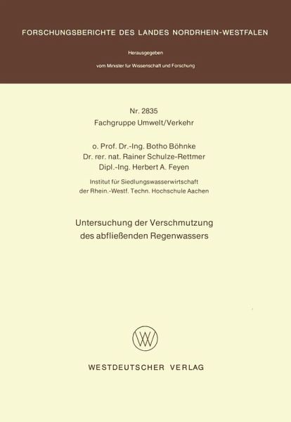 1. Einleitung.- 1.1 Veranlassung.- 1.2 Bisheriger Wissensstand.- 2. Messung des Regens und des Abflusses.- 2.1 Meßgebiet "Muffet".- 2.2 Meßgebiet "Tivoli".- 2.3 Meßgebiet "Hüttenbach".- 2.4 Konstruktion und Einsatz der Geräte.- 3. Beschreibung der Analytik.- 3.1 Sichttiefe.- 3.2 Sedimente.- 3.3 Trockensubstanz.- 3.4 Glühverlust.- 3.5 Leitfähigkeit.- 3.6 pH- Wert.- 3.7 BSB5.- 3.8 CSB.- 3.9 TOC.- 3.10 Phosphat.- 3.11 Nitrit.- 3.12 Nitrat.- 3.13 Ammonium.- 3.14 Ölgehalt.- 4. K?ima und Witterung.- 4.1 Definition der Regentypen.- 4.2 Wettermessungen.- 5. Ergebnisse.- 5.1 Mittelwerte der Verschmutzung des abfließenden Regenwassers.- 5.2 Regen und Abfluß.- 5.3 Fremdwasser, Fehleinleitungen.- 5.4 Frachten.- 6. Zusammenfassung.