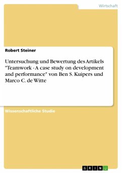 Wissenschaftliche Studie aus dem Jahr 2005 im Fachbereich Führung und Personal - Sonstiges, Note: 1,5, Wirtschaftsuniversität Wien (Abteilung für Personalmanagement), Veranstaltung: Personalentwicklung, Sprache: Deutsch, Abstract: Der vorliegende Artikel "Teamwork: a case study on development and performance" von Ben S. Kuipers und Marco C. de Witte bezieht sich auf eine Studie, die von September 1999 bis Februar 2000 über Volvos Werk in Umeå zur Herstellung von Lastwagen-Kabinen durchgeführt wurde. Im Gegensatz zu vielen anderen Studien, die bereits Zusammenhänge zwischen Teamentwicklung und Teamleistung untersucht haben, bezieht sich dieser Artikel nicht nur auf subjektive Teamleistungskriterien, sondern auch auf objektive Kriterien wie Produktqualität, Produktivität, Liefergenauigkeit etc.