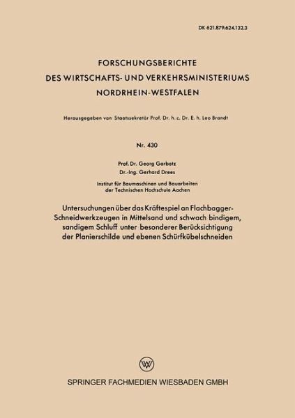 Gliederun.- 1. Einleitung.- 2. Die untersuchten Bodenarten und Schneidwerkzeuge.- 3. Die Versuchseinrichtung.- 4. Die Grundlagen für die Auswertung der Meßergebnisse.- 5. Die Versuchsdurchführung.- 6. Die Vorversuche mit ebenem Schneidmesser im Mittelsand.- 7. Die Hauptversuche im Mittelsand.- 8. Die Hauptversuche in schwach bindigem sandigen Schluff.- 9. Ergänzungsversuche.- 10. Entwicklung von Formeln für die Hauptschnittkraft.- 11. Praktische Hinweise für die Gestaltung der Flachbagger,.- 12. Zusammenfassung der Versuchsergebnisse.- 13. Literaturverzeichnis.