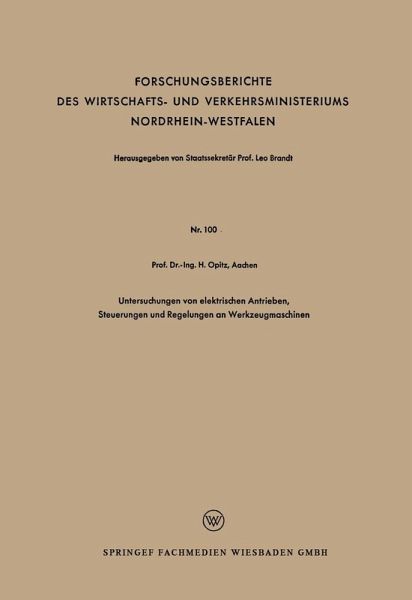 Gliederung.- II. Einleitung.- III. Allgemeines.- IV. Begriffe der Steuerungs- und Regelungstechnik.- V. Arten von Werkzeugmaschinenantrieben.- VI. Untersuchung der Antriebsverhältnisse an einem Drehautomaten.- VII. Kenntafeln für Antriebsverhältnisse.- VIII. Beispiele zur Kenntafelermittlung.- 1. Allgemeines.- 2. Drehzahlbilder.- 3. Schwungmomente.- 4. Hochlauf-, Brems- und Umsteuerzeiten einer Revolverdrehbank.- 5. Wirkungsgradmessung an Drehbänken.- IX. Statistische Untersuchung von Fertigungsvorgängen.- X. Untersuchung geregelter Antriebe.- 1. Untersuchungen über die Betriebssicherheit elektronischer Regelantriebe durch Erprobung im Dauerversuch.- 2. Meßtechnische Untersuchung moderner Regelantriebe.- XI. Betrachtungen zur Wirtschaftlichkeit von Steuerungen und Regelungen.- 1. Verfahrensvergleiche und Festlegung der optimalen Losgrößen in der Massenfertigung.- 2. Vergleich der Wirtschaftlichkeit bei Drehvorgängen mit und ohne Schnittgeschwindigkeitsregelung.- 3. Über die Wirtschaftlichkeit der stufenlosen Drehzahlregelung.- 4. Zusammenfassung und Schlußbetrachtung zur Wirtschaftlichkeit von Steuerungen und Regelungen.- XII. Literaturverzeichnis.