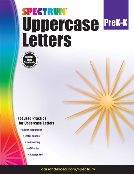 Spectrum(R) Uppercase Letters for prekindergarten to kindergarten provides practice in recognizing and writing uppercase letters. Aligned to state standards, this title offers activities in identifying letters, finding letters within words, and using proper handwriting strokes. The Spectrum(R) series offers early learning workbooks that help your child thrive in today's standards-based classroom. Spectrum(R) Uppercase Letters builds reading and writing readiness with focused instruction and rigorous practice to support mastery of this essential language arts skill.Spectrum(R) is your child's path to academic success. This best-selling workbook series provides quality educational activities that meet your child's needs for learning achievement. These comprehensive workbooks address essential skills in reading, language arts, math, and science. Students in prekindergarten to grade 8 will find lessons and exercises that help them progress through increasingly difficult subject matter. Complete answer keys, content reviews, and assessments help students track their progress and locate areas for improvement. No matter your child's academic need, Spectrum(R) is with you every step of the way.