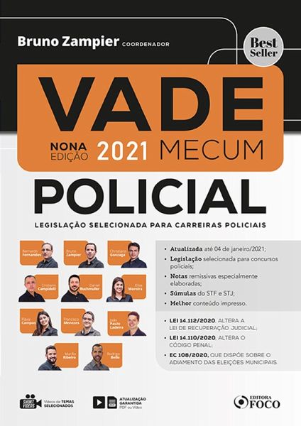 "Seja muito bem-vindo à 9ª Edição do VADE MECUM POLICIAL! Após o sucesso das quatro primeiras edições, que se esgotaram, apresentamos esta, ainda mais completa e focada nos concursos policiais. Como professor de cursos preparatórios para concursos públicos desde o ano de 2002, percebemos claramente a cobrança cada vez mais específica e relacionada ao cargo pretendido. É a chamada pertinência temática. Neste sentido, inicia-se a busca pela melhor preparação possível, devendo o candidato frequentar cursos, ler doutrina e jurisprudência direcionadas e, claro, ter acesso à vasta legislação exigida pelos editais. É o que naturalmente ocorre também no âmbito das carreiras policiais, a exemplo de Delegado de Polícia, Agente, Investigador, Escrivão, Papiloscopista, Perito Criminal, Policial Rodoviário Federal, Oficial ou Soldado das Polícias Militares. A preparação para tais concursos envolve o acesso a legislação específica, confecção de peças de polícia judiciária, testes de aptidão física, exames médicos rigorosos, investigação social, aprovação em cursos de formação promovidos por academias de polícia entre outros desafios. Com o objetivo de atender aos seus anseios em busca do objetivo final, as principais leis exigidas nos concursos policiais foram reunidas e sistematizadas por uma experiente equipe de professores. Elaboramos uma criteriosa remissão de artigos e súmulas a fim de facilitar os estudos de nosso futuro colega policial: você! Foi desta forma que criamos o produto que agora tem em suas mãos e que certamente colaborará não apenas em sua jornada como candidato, mas também no exercício da nobre profissão de policial. Aos estudos!" Bruno Zampier