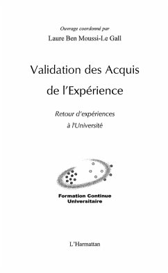 Vingt-deux auteurs, professionnels de la VAE, de la Formation Tout au Long de la Vie, ont cherche a valoriser la mutualisation des experiences menees a partir de leur universites respectives, en developpant a cette occasion des reflexions et des analyses autour de thematiques mobilisees par la VAE.
