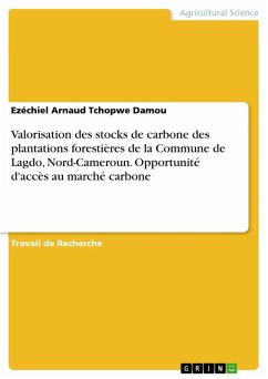 Travail de Recherche de l'année 2023 dans le domaine Foresterie (Sylviculture) / Sciences Forestière, note: 17/20, , cours: Changement climatique et Financement carbone, langue: français, résumé: La présente étude qui porte sur la « valorisation des stocks de carbone des plantations forestières de la Commune de Lagdo, Nord-Cameroun : opportunité d'accès au marché carbone » S'inscrit dans le cadre de la stratégie de réduction des Gaz à effet de Serre. Cette dernière a été menée du 1 er août au 30 octobre 2022 et du 1er janvier 2023 jusqu'au 30 mai 2023. Elle avait pour objectif de valoriser les stocks de carbone des différentes plantations forestières dans la Commune de Lagdo dans une perspective d'accès au marché de carbone. Concrètement, il s'agissait, après avoir identifié les différentes plantations forestières, d'évaluer les potentiels stocks de carbone de ces dernières, de proposer un mécanisme d'injection des fonds dans la Commune de Lagdo et un schéma de financement des fonds issus de la vente des stocks de carbone. L'approche méthodologique a consisté en des entretiens avec le Maire et neuf acteurs porteurs des différentes plantations forestières, et à un inventaire de préinvestissement. Au total, 327 placettes circulaires de 20 m de rayon ont fait l'objet de collecte des données de DHP supérieur à 10 cm et de hauteur. La méthode non destructrice a été utilisée pour quantifier le carbone stocké à travers la formule allométrique de Chave et al. (2005) et Cairns et al. (1997). Le logiciel Impact Toolbox a été utilisé pour élaborer le scenario de référence. Les enquêtes ont été menées auprès de 15 experts en finance carbone et en inventaire de GES pour identifier le mécanisme d'injection des fonds et déterminer la valeur du crédit carbone.