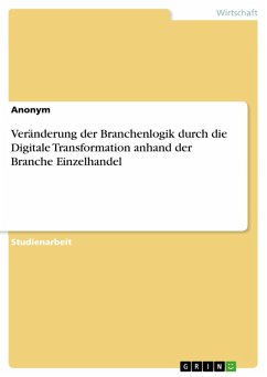 Studienarbeit aus dem Jahr 2023 im Fachbereich BWL - Allgemeines, Note: 1,5, ( Europäische Fernhochschule Hamburg ) (Digital Business Management), Veranstaltung: Digital Work and Collaboration, Sprache: Deutsch, Abstract: Die vorliegende Arbeit befasst sich mit der Thematik der digitalen Transformation. Am Beispiel des Einzelhandels soll demonstriert werden, inwiefern sich die Branchenlogik über die Jahre verändert hat. Die digitale Transformation sowie die damit verbundenen Herausforderungen und Chancen sind ein stark diskutiertes Thema. Sowohl unser persönliches als auch berufliches Umfeld wird dadurch mit tiefgreifenden Veränderungen konfrontiert. Die Veränderungen werden von der rasanten Entwicklung digitaler Technologien angetrieben, die nahezu jeden Bereich unseres Lebens betreffen. Fortschrittliche Technologien wie Cloud-Computing, künstliche Intelligenz, Big Data, das Internet der Dinge und Blockchain beeinflussen maßgeblich die Zukunft von Unternehmen unterschiedlicher Branchen und Größen. Die disruptive Wirkung der digitalen Transformation ermöglicht es sogar branchenfremden Wettbewerbern, in neue Märkte einzutreten und die Marktanteile etablierter Unternehmen zu bedrohen. Unternehmen stehen vor der Herausforderung, diesen Veränderungen proaktiv zu begegnen und ihre Innovationsfähigkeit unter Beweis zu stellen. Dabei geht es nicht nur um die Weiterentwicklung bestehender Produkte und Dienstleistungen oder die Digitalisierung herkömmlicher Prozesse, sondern auch um die Erschaffung neuer, innovativer digitaler Geschäftsmodelle. Diese ermöglichen es, neue Möglichkeiten der Wertschöpfung zu erkennen und sinnvoll zu nutzen.