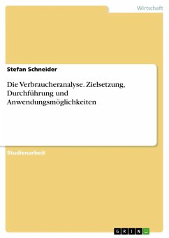 Studienarbeit aus dem Jahr 2003 im Fachbereich BWL - Offline-Marketing und Online-Marketing, Note: 1, Hochschule Pforzheim, Sprache: Deutsch, Abstract: Menschen unterscheiden sich stark in ihren Interessen, Verhaltensweisen und Einstellungen. In verschiedenen Studien werden diese Unterschiede analysiert. Eine dieser Studien ist die Verbraucheranalyse (VA). Sie ist neben der Mediaanalyse (MA), der Allensbacher Werbeträgeranalyse (AWA) und der Typologie der Wünsche (TdW) eine der meistgenutzten deutschen Markt-Media- Studien. Im Rahmen dieser Arbeit soll die VA vorgestellt werden. Zu Beginn werden die Zielsetzung und der Nutzen der Studie verdeutlicht. Im Anschluss daran folgt ein kurzer Überblick über die Entstehung und die Entwicklung der VA, bevor in Kapitel 4 bis 7 die Inhalte, Durchführung und Auswertungsmöglichkeiten vorgestellt werden. Eine Auswahl von Ergebnissen der aktuellen VA rundet die Arbeit ab.