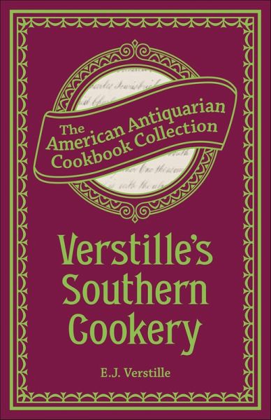 We do not have specific information about how Mrs. E.J. Verstille of Georgia acquired her cookery skills, but it is likely that one of her reasons for compiling her cookbook was to preserve the traditions of southern cookery during the chaotic post-Civil War reconstruction era. Her recipes have a distinct Germanic flavor, but they also represent the classic culinary methods and ingredients of the South. Her chapters include Soups, Fish, Meats, Sauces, Vegetables, Bread, Battercakes and Waffles, Yeast, Cakes. Icing, Pastry, Puddings and Custards, Promiscuous Dishes, Preserves, Jellies, Wines and Cordials, Pickles, Dishes for the Sick, and Miscellaneous. (household advice and general techniques). This edition of Verstille's Southern Cookery by Mrs. E.J. Verstillewas reproduced by permission from the volume in the collection of the American Antiquarian Society, Worcester, Massachusetts. Founded in 1812 by Isaiah Thomas, a Revolutionary War patriot and successful printer and publisher, the Society is a research library documenting the life of Americans from the colonial era through 1876. The Society collects, preserves, and makes available as complete a record as possible of the printed materials from the early American experience. The cookbook collection includes approximately 1,100 volumes.