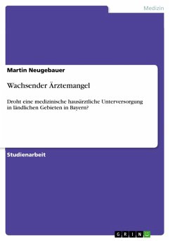 Studienarbeit aus dem Jahr 2016 im Fachbereich Gesundheit - Public Health, Note: 2,0, Hochschule für angewandtes Management GmbH, Sprache: Deutsch, Abstract: In der nachfolgenden Arbeit soll untersucht werden, ob sich aus der Überalterung in der Ärzteschaft und der daraus resultierenden Welle von Praxisschließungen in ländlichen Gebieten Bayerns eine drohende Gefahr der medizinischen Unterversorgung für Patienten ergeben kann. Insbesondere soll dargestellt werden, worin die Ursachen dafür liegen und welche Maßnahmen ergriffen werden können, um der möglichen Unterversorgung und den daraus entstehenden Problemen entgegen zu wirken.