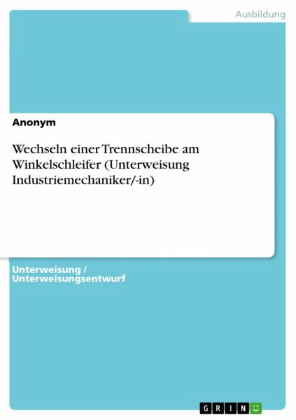 Unterweisung / Unterweisungsentwurf aus dem Jahr 2024 im Fachbereich AdA Handwerk / Produktion / Gewerbe - Mechanische Berufe, Metall und Kunststoff, Note: 94, Industrie- und Handelskammer Bodensee-Oberschwaben, Sprache: Deutsch, Abstract: Ich habe den Wechsel einer Trennscheibe am Winkelschleifer bei einem Auszubildenden aus dem ersten Lehrjahr mittels der Vier-Stufen-Methode vermittelt. Groblernziel: b) mechanische und elektrische Bauteile und Verbindungen auf mechanische Beschädigungen sichtprüfen, instand setzen oder die Instandsetzung veranlassen a) Betriebsbereitschaft von Werkzeugmaschinen einschließlich der Werkzeuge sicherstellen Feinlernziel: Hierbei werden dem Auszubildenden spezielle Kenntnisse vermittelt, um diese bei Störungen, Mängeln sowie Fehler zu erkennen. Dieses Lernziel gilt als erreicht, wenn er die oben genannten Arbeitsschritte fehlerfrei durchgeführt hat und die Tätigkeiten nach der Unterweisung selbständig durchführen kann.
