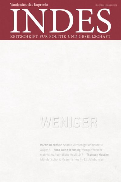 Die INDES 3/2023 widmet sich im Schwerpunkt dem "Weniger". Bescheidungsimperative begegnen uns derzeit allerorten, sei es im Zusammenhang mit dem Klimawandel, dem demografischen Wandel oder den Folgen des russischen Angriffskriegs auf die Ukraine. Wie werden solche Einschränkungen vermittelt und wie reagiert die Bevölkerung hierauf, welche Instrumente sind erfolgversprechend? Wann und wo hat Verzicht historisch funktioniert oder wurde er literarisch oder popkulturell vorgedacht, und taugen diese Beispiele als Blaupause für künftige Zumutungen? Welche "Trade-offs" existieren - sind die notwendigen Veränderungen zum Beispiel nur mit einem Weniger an demokratischer Mitbestimmung durchzusetzen? Zudem geht es in diesem Heft auch um ein less is more im Sinne freiwilliger Selbstbescheidung - zu denken ist hier etwa an gesellschaftliche Trends wie Minimalismus - und das ambivalente Verhältnis von Verzicht und Genuss.