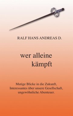 Das jüngste Buch des Autors RALF HANS ANDREAS D.. Titel: " wer alleine kämpft " Eine Science-Fiction-Erzählung mit harscher Kritik an der Gegenwart. Wer sieht die Folgen? In diesem Buch kommt so ziemlich alles vor: Von fantastischen Abenteuern bis hin zu Liebe und Mord. Der Autor wagt einen mutigen Blick in eine mögliche Zukunft. Was werden wir noch erleben? Auch eine Zukunft, in welcher die Mehrheit des Volkes gar nicht mitbekommen wird, wie man die Menschen bewusst verdummt und manipuliert? Viele mögen dazu sogar noch applaudieren! "Hurra, wie geht es uns doch gut!" Zu den derzeitigen großen Sünden zählen: uneingeschränkte Freiräume für jegliches Großkapital, schleichende Aushöhlung der Demokratie, Wegsehen vieler.Und was könnte an Unbekanntem hinter den großen Weltraumprojekten stehen? Wirklich alles zum Nutzen der Menschheit? Summa summarum: ungewöhnliche Abenteuer und nützliche Lebensphilosophie.