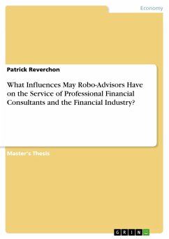 Master's Thesis from the year 2017 in the subject Business economics - Company formation, Business Plans, grade: 2,0, Liverpool John Moores University, language: English, abstract: This research project is going to examine and evaluate a new phenomenon of the financial advisory services market, the so called Robo-Advisors (RA). They represent the next stage of the evolution in the financial advisory and wealth management industry. RA are a new type of financial adviser or portfolio manager, which work solely online and with minimal human intervention and they stepped right into competition with human wealth managers. In a generation that grew up with the internet, computers and mobile devices, RA have the potential to start their triumph procession making many jobs of professional human financial consultants obsolete. The main objective of this research project is to sketch an overview of possibilities and disadvantages of Robo-Advisors in the future and give an outline to the academic research that will be needed in the future. This thesis is one of the first academic papers in English language, examining RA and their possible impact on the industry. As a field study, it delivers a broad overview of a large amount of topics describing the various characteristics of a fully automatic asset management system, and the competitive situation with human consultants or asset managers.