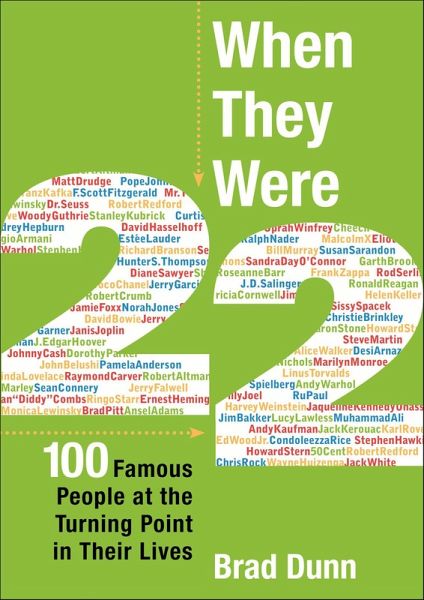 Brad Dunn's When They Were 22 tells the stories of famous people and the fateful events and choices they faced at the all-important age of 22. From writers, actors, and musicians to politicians, hip-hop moguls, criminals, and porn stars, When They Were 22 chronicles some of the most legendary, influential, and controversial celebrities during the most pivotal year of their lives. Just a few examples: