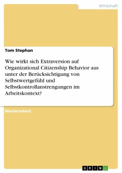 Masterarbeit aus dem Jahr 2025 im Fachbereich BWL - Organisation, Note: 2.0, Universität Bielefeld, Sprache: Deutsch, Abstract: Diese Masterarbeit ist deduktiv angelegt und befasst sich mit dem Verhalten in Organisationen. Im Mittelpunkt steht die Untersuchung der Zusammenhänge zwischen Extraversion, arbeitsbezogenem Selbstwertgefühl, Selbstkontrollanstrengungen (resisting distraction) und organisationalem Citizenship Behavior (OCB). Die Datenerhebung erfolgte im Rahmen einer zweiwöchigen Tagebuchstudie mit N = 221 Personen. Mittels SPSS-Makro wurde eine Regressionsanalyse in Form einer moderierten Mediation nach Modell 14 (Hayes, 2013) durchgeführt. Abschließend wurden die Stärken und Schwächen der Studie sowie theoretische und praktische Implikationen diskutiert.