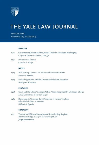 This issue of the Yale Law Journal (the fifth issue of academic year 2015-2016) features articles and essays by notable scholars, as well as extensive student research. The issue's contents include: "Governance Reform and the Judicial Role in Municipal Bankruptcy," by Clayton P. Gillette & David A. Skeel, Jr. "Professional Speech," by Claudia E. Haupt "Casey and the Clinic Closings: When 'Protecting Health' Obstructs Choice," by Linda Greenhouse & Reva B. Siegel "Returning to Common-Law Principles of Insider Trading After United States v. Newman," by Richard A. Epstein The student contributions are: Note, "Will Putting Cameras on Police Reduce Polarization?," by Roseanna Sommers Note, "Federal Questions and the Domestic-Relations Exception," by Bradley G. Silverman Comment, "Toward an Efficient Licensing and Rate-Setting Regime: Reconstructing Sec. 114(i) of the Copyright Act," by Joseph Pomianowski