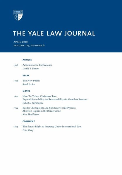 This issue of the Yale Law Journal (the sixth issue of academic year 2015-2016) features articles and essays by notable scholars, as well as extensive student research. The issue's contents include: Article, "Administrative Forbearance," by Daniel T. Deacon Essay, "The New Public," by Sarah A. Seo The student contributions are: Note, "How To Trim a Christmas Tree: Beyond Severability and Inseverability for Omnibus Statutes," by Robert L. Nightingale Note, "Border Checkpoints and Substantive Due Process: Abortion in the Border Zone," by Kate Huddleston Comment, "The State's Right to Property Under International Law," by Peter Tzeng Quality digital editions include active Contents for the issue and for individual articles, linked footnotes, active URLs in notes, and proper digital and Bluebook presentation from the original edition.