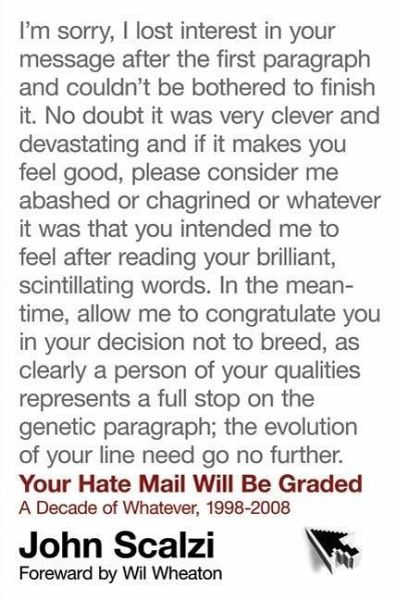 On September 13, 1998, John Scalzi sat down in front of his computer to write the first entry in his blog Whatever--and changed the history of the Internet as we know it today. What, you're not swallowing that one? Okay, fine: He started writing Whatever and amused about 15 people that first day. If that many. But he kept at it, for ten years and running. Now 40,000 people drop by on a daily basis to see what he's got to say. About what? Well, about whatever: Politics, writing, family, war, popular culture and cats (especially with bacon on them). Sometimes he's funny. Sometimes he's serious (mostly he's sarcastic). Sometimes people agree with him. Sometimes they send him hate mail, which he grades on originality and sends back. Along the way, Scalzi's become a best-selling, award-winning author, a father, and a geek celebrity. But no matter what, there's always another Whatever post to amuse and/or enrage his readers. Your Hate Mail Will Be Graded collects some of the best and most popular Whatever entries from the first ten years of the blog - a decade of Whatever, presented in delightfully random form, just as it should be. * Winner of the 2009 Hugo Award for Best Non-Fiction Book * Introduction by Star Trek actor Wil Wheaton Old Man's War Series #1 Old Man's War #2 The Ghost Brigades #3 The Last Colony #4 Zoe's Tale #5 The Human Division #6 The End of All Things Short fiction: "After the Coup" Other Tor Books The Android's Dream Agent to the Stars Your Hate Mail Will Be Graded Fuzzy Nation Redshirts Lock In The Collapsing Empire (forthcoming) At the Publisher's request, this title is being sold without Digital Rights Management Software (DRM) applied.