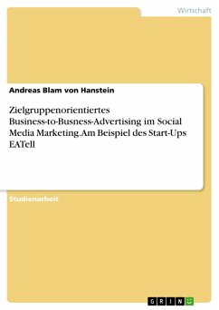 Studienarbeit aus dem Jahr 2017 im Fachbereich BWL - Offline-Marketing und Online-Marketing, Hotelfachschule Heidelberg - Fritz-Gabler-Schule, Sprache: Deutsch, Abstract: Diese Arbeit will darstellen, wie in einem geeigneten sozialen Netzwerk durch zielgruppenorientiertes Advertising neue Interessenten und Kundenkontakte - sogenannte Leads - zu generieren sind. Soziale Netzwerke bieten heute vielversprechende Möglichkeiten, potentielle Nutzer und Kunden zielgruppengerecht zu erreichen und zusätzlich davon zu profitieren, dass die Empfänger eine für sie relevante Werbebotschaft in Form eines Textes, Bildes oder Videos teilen und weiterleiten. Die Werbebotschaft verteilt sich so binnen kurzer Zeit wie ein Virus in einer Community oder im Internet (sogenannter viraler Effekt). Für Nischenanbieter und kleinere Unternehmen ist es besonders interessant, Instrumente des Online-Marketings zu nutzen. Einerseits schreitet die Digitalisierung der Gesellschaft und der Wirtschaft gewaltig voran, womit sich die Kontaktaufnahme zu Kunden und die Pflege dieser Kontakte zunehmend in das Internet verlagert. Andererseits wird es auch bei einem geringen Marketing-Budget möglich, die relevante Zielgruppe kostengünstig zu erreichen, beispielsweise durch Werbebanner. Im Rahmen dieser Arbeit soll am Beispiel des Start-Ups EATell erläutert werden, welches soziale Netzwerk sich als geeignet erweist, um einen Social-Media-Auftritt eines B2B-Unternehmens zu entwickeln und als Grundlage für den Ausbau der Online-Marketing-Strategie zu dienen. Dazu wird auf die Entwicklung eines Unternehmensprofils und die dabei entstehenden Kosten eingegangen. Des Weiteren soll beispielhaft eine zielgruppenorientierte Platzierung von Werbung vorgenommen werden und dessen Auswirkung auf die Besucherzahl des Profils sowie die Anzahl der daraus resultierenden neuen Kontaktaufnahmen erhoben werden. Abschließend erfolgt eine strategische Handlungsempfehlung für die Ausrichtung des Social-Media-Auftritts.