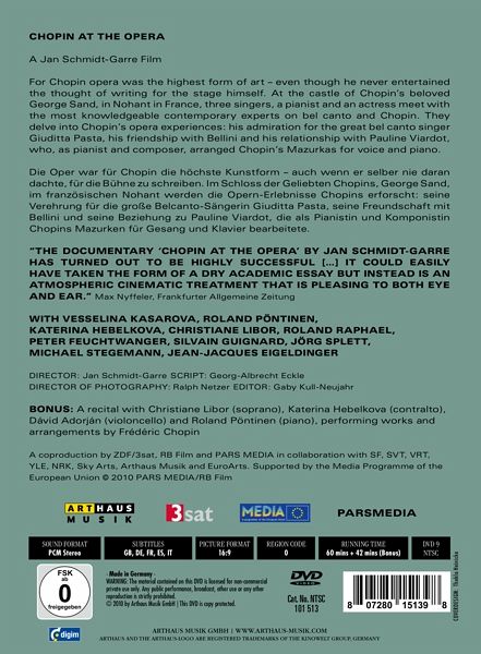 "The wrist - the breath in the voice." (Frédéric Chopin) The opera for Chopin was the highest form of art - even though he never entertained the thought of writing for the stage himself. His contemporaries Bellini, Donizetti and Rossini meant more to him than Beethoven, Liszt or Schumann. They influenced the songful lines of his piano music, and their coloraturas are reflected in its flow, its trills and cadences. At the castle of Chopin's beloved George Sand, in Nohant in France, three singers, a pianist and an actress meet with the most knowledgeable experts on Bel Canto and Chopin of our time. For one whole week in late autumn they delve for Chopin's opera experiences: his admiration for the great Bel Canto singer Giuditta Pasta, his friendship with Bellini and his relationship with Pauline Viardot, daughter of tenor Manuel Garcia and sister of Malibran, who, as pianist and composer, worked on Chopin's Mazurkas for voice and piano. These Mazurkas, as well as pure piano compositions - are rehearsed and discussed in Nohant and, by means of mezzo-soprano Katerina Hebelkova and soprano Christiane Libor's voices, unfold their songful potential.Great Bel Canto artist Vesselina Kasarova complements Chopin's music with the sources of his inspiration by singing arias by Rossini and Bellini.