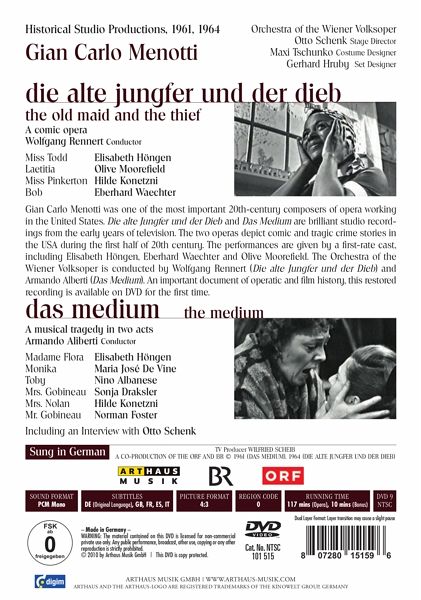 Der 2007 verstorbene Gian Carlo Menotti war einer der bedeutendsten amerikanischen Opernkomponisten des 20. Jahrhundert. Die beiden vorliegenden Opern Die alte Jungfer und der Dieb und Das Medium sind einzigartige Studioproduktionen aus den frühen Jahren des Fernsehens. Sie schildern komische und tragische Kriminalgeschichten während der ersten Hälfte des 20. Jahrhundert und sind dem amerikanischen Alltag entnommen. Die Aufführungen sind erstklassig besetzt: Elisabeth Höngen, Eberhard Waechter und Olive Moorefield glänzen in ihren Rollen. Das Orchester der Wiener Volksoper steht unter der musikalischen Leitung von Wolfgang Rennert (Die alte Jungfer und der Dieb) und Armando Alberti (Das Medium). Ein wichtiges Dokument der Opern- und Filmgeschichte, welches in dieser restaurierten Fassung erstmalig auf DVD vorliegt.