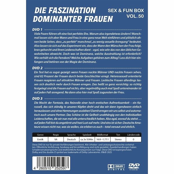 DVD 1: Viele Paare führen oft eine fast perfekte Ehe. Warum also irgendetwas ändern? Manchmal lassen sich aber Mann und Frau in eine ganz neue Welt einführen und plötzlich ahnen beide Seiten, dass "zu perfekt" manchmal "zu wenig sexuelle Anregung" bedeutet. Also lassen sie sich auf das Experiment ein, dass der Mann den Wünschen der Frau folgt, brav gehorcht und ihren Leidenschaften dient - egal, wie sehr das von den üblichen Gewohnheiten abweicht. Doch was ist Dominanz, welche Ausstrahlung ist