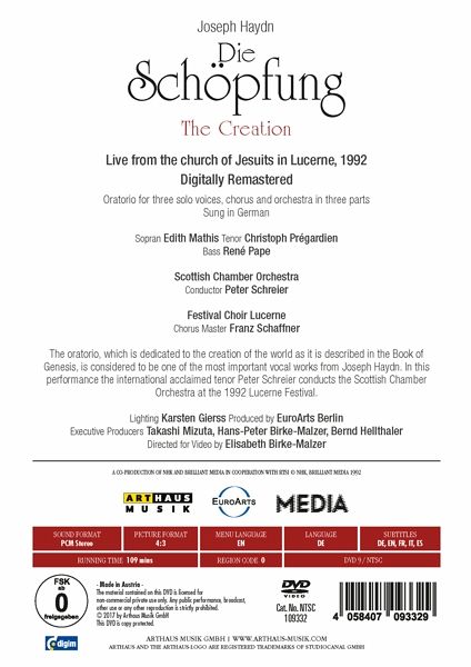 The oratorio, which is dedicated to the creation of the world as it is described in the Book of Genesis, is considered to be one of the most important vocal works from Joseph Haydn. In this performance the international acclaimed tenor Peter Schreier conducts the Scottish Chamber Orchestra at the 1992 Lucerne Festival. Featuring the well-known stars Edith Mathis, René Pape and Christoph Prégardien.Das Oratorium Die Schöpfung gehört zu den wichtigsten Vokalwerken Joseph Haydns und widmet sich der Erschaffung der Welt, so wie es in der Genesis beschrieben steht. Über die erste öffentliche Aufführung ist ein volkstümlicher Bericht überliefert, in dem folgende bemerkenswerte Passage steht: "Damit's alle Leut verstehn, was d'Musik hat sagn wolln, so haben sies Büchl von der Kantate gratis austheilt, und das ist wunderschön z'lesen: und was mir gar gut gfalln hat, es ist hoch geschribn, und doch verständlich dabei." Das gilt aber nicht nur für das "Büchl", das Textbuch Gottfried van Swietens, sondern gleichermaßen für Haydns Musik. Es ist ein gewaltiges Werk mit tiefsinnigem Inhalt, das jedoch von der ersten Aufführung an von Erfolg gekrönt war und seither zahlreich interpretiert wurde. Beim Musikfestival in Luzern 1992 gelang das monumentale Werk mit dem Schottischen Kammerorchester unter dem Dirigat des international anerkannten Tenors Peter Schreier zur Aufführung. Als Solisten sind die berühmte und vielmals ausgezeichnete Sopranistin Edith Mathis, der herausragende lyrische Tenor Christoph Prégardien sowie der gefragte Opernsänger René Pape zu erleben.