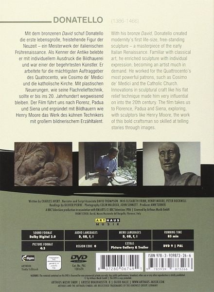 Mit dem bronzenen David schuf Donatello die erste lebensgroße, freistehende Figur der Neuzeit - ein Meisterwerk der italienischen Frührenaissance. Als Kenner der Antike belebte er mit individuellem Ausdruck die Bildhauerei und war einer der begehrtesten Künstler. Er arbeitete für die mächtigsten Auftraggeber des Quatrocento, wie Cosimo de' Medici und die katholische Kirche. Mit plastischen Neuerungen, wie seine Flachrelieftechnik, sollte er bis ins 20. Jahrhundert wegweisend bleiben. Der Film führt uns nach Florenz, Padua und Siena und ergründet mit Bildhauern wie Henry Moore das Werk des kühnen Technikers mit großen bildnerischem Erzähltalent.