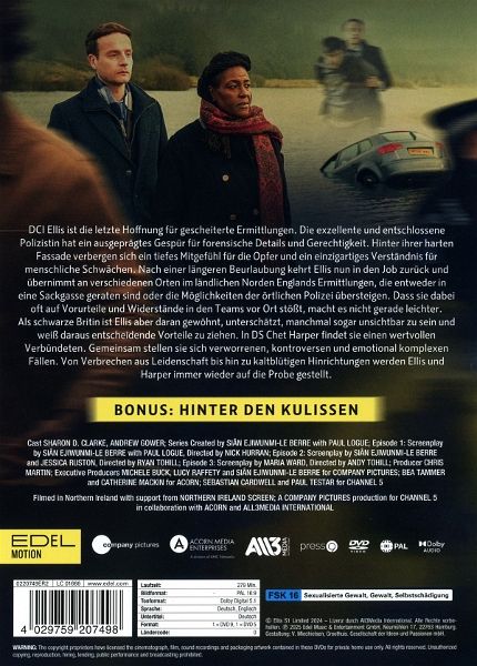 Die Macher der Serie, haben dem neuen Ermittlerduo, drei relativ knifflige Fälle auf den Leib geschrieben. Jeweils in Spielfilmlänge, müssen sie Licht ins Dunkel bringen und stoßen dabei oftmals zunächst auf eine Mauer des Schweigens von Seiten Verdächtiger, aber auch der örtlichen Polizei. DCI Ellis ist keine Frau vieler Worte, sie ist dafür eine exzellente Beobachterin und weiß sich durchzusetzen. Es mag vielleicht nicht einfach sein ihr Vertrauen und ihr Wohlwollen zu gewinnen und sie schweigt sich über ihren privaten Hintergrund lieber aus, doch sitzt ihr Herz am rechten Fleck. Das muss auch DS Chet Harper herausfinden. Anfangs weiß man als Zuschauer nicht so genau, ob der linkisch und schüchtern wirkende Ermittler wirklich als Partner geeignet ist, doch seine stille Cleverness zeichnet ihn dann letztendlich aus und die Zusammenarbeit zwischen den beiden, sorgt für die nötigen heiteren Momente. Jedoch und das sollte man wissen, wenn man sich diese neue britische Krimiserie zu Gemüte führen möchte, haftet ihr eine gewisse Langsamkeit des Erzählens an und dazu sind die Fälle geprägt von Melancholie und Düsternis. Hinsichtlich der psychologischen Aspekte die sich bei der Tätersuche ergeben, entwickelt die Serie jedoch durchaus Spannung, wenn man sich mit dem angesprochenen Punkt arrangieren kann.