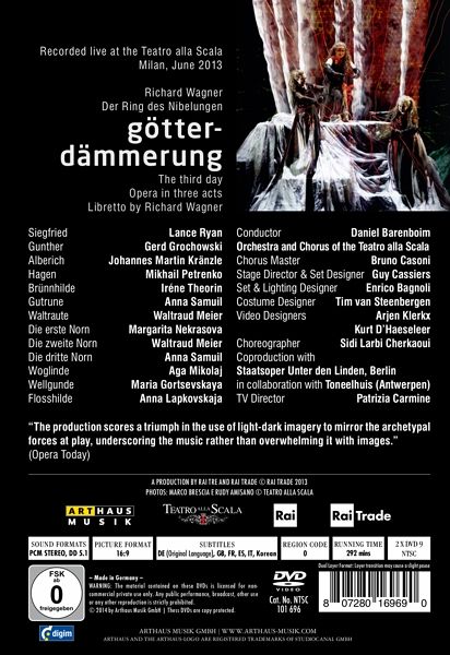 Mit dieser Aufnahme der "Götterdämmerung" aus dem Jahre 2013 wurde der musikalisch wie optisch überwältigende "Ring"-Zyklus von Daniel Barenboim und Guy Cassiers an der Mailänder Scala vervollständigt und erwies sich als einer der Höhepunkte des Wagner-Jubiläums. Die weltweit gefeierte Wagnerinterpretin Iréne Theorin übernimmt die Partie der Brünnhilde, an ihrer Seite setzt Lance Ryan sein strahlendes Portrait des tragischen Helden Siegfried fort. Mikhail Petrenko als dunkler Gegenspieler Hagen und Johannes Martin Kränzle, der erneut als dessen Vater Alberich brilliert, sind ebenfalls Teil der erstklassigen Sängerbesetzung. Publikumsliebling Waltraud Meier begeistert mit ihrem eindrucksvollen Auftritt als Brünnhildes Schwester Waltraute. "Götterdämmerung", der letzte Teil von Wagners "Ring des Nibelungen", ist eine menschliche Tragödie. Zwei im Grunde gutartige Wesen, die durch ihre Beziehung mit den Göttern zum Unglück verdammt sind, erfahren in der Welt der Menschen Betrug und Bösartigkeit.Hinweis: Dieser Artikel kann nur an eine deutsche Lieferadresse ausgeliefert werden.