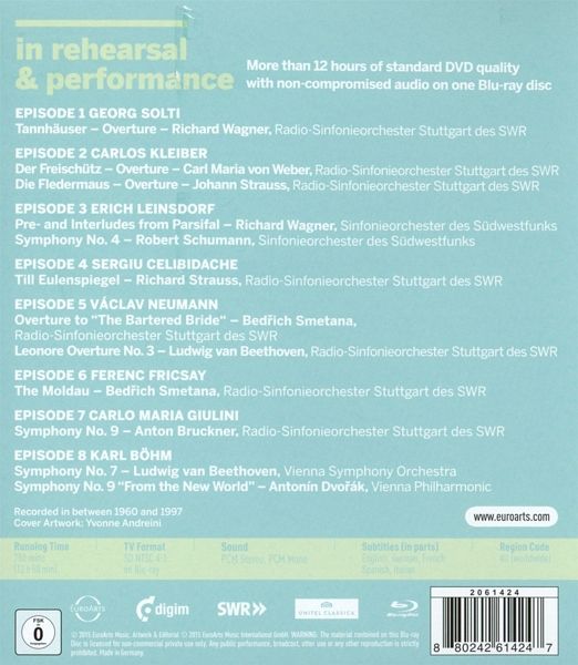 Diesen Herbst veröffentlicht EuroArts Music eine Blu-Ray-Disc, die ein Must-Have für alle Fans traditioneller, klassischer Musik für Orchester ist: In Rehearsal & Performance. Die Veröffentlichung enthält über 12 Stunden Material in Standard-DVD-Qualität auf einer Blu-ray Disc. Es handelt sich um einen Rerelease historischer Aufnahmen in einer neuen Edition, mit brilliantem Klang. Das Konzept von In Rehearsal & Performance hält genau das, was der Titel verspricht: Proben- und Konzertaufnahmen. Die Kamera begleitet Dirigenten von Weltklasse wie bspw. Carlos Kleiber, Ferenc Fricsay und Georg Solti, während sie ein Werk von Beethoven, Smetana oder Dvorák proben und dann in die Aufführung von besagtem Werk. Auf diese Weise bietet die Veröffentlichung dem Zuschauer die einzigartige Gelegenheit, Dirigenten zu erleben und zu vergleichen, während sie vor dem Orchester stehen. Und sie bietet die Gelegenheit, mitzuverfolgen, wie ein Werk sich im Laufe der Zeit ändert, wenn ein Dirigent es in den Proben formt und gestaltet bis es für das Konzert genau so klingt, wie von ihm gewünscht. Aufgenommen zwischen 1960 und 1997.