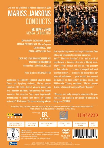 Nach dem erfolgreichen Beethoven-Zyklus veröffentlicht Arthaus Musik mit Giuseppe Verdis "Messa da requiem" eine weitere Meisterleistung des lettischen Dirigenten Mariss Jansons. Zusammen mit dem exzellenten Chor und Symphonieorchester des Bayerischen Rundfunks verwandelt er den Goldenen Saal des Wiener Musikvereins in einen Vorort des Himmels. Von den ersten behutsamen Takten an demonstrierte das Rundfunkorchester einmal mehr "seinen führenden Rang unter den deutschen Orchestern." (Die Presse) Die vier hervorragenden Solisten vereinigen sich, um die ganze Bandbreite an Emotionen abzubilden -…mehr