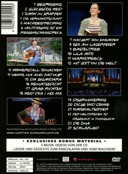 Auch mit 'Gscheid Gfreid', ihrem mittlerweile fünften Programm, verlässt Martina Schwarzmann die ausgetrampelten Pfade des Humors und geht sicheren Schrittes querfeldein. Die mit zahlreichen Kabarettpreisen ausgezeichnete Oberbayerin nimmt einen mit an Orte, an denen die Gedanken noch nie vorher gewesen sind, und wenn einem doch etwas bekannt vorkommt, kann es gut sein, dass man vielleicht gerade in sich geht und sich selbst wiedererkennt. Ein Abend voller kluger Gedanken, schräger Geschichten und bisher ungesungener Lieder erwartet die Besucher und beim Heimgehen wird man sagen: 'Heid hama uns gscheid gfreid!' Die Ausnahmekabarettistin mit der Gitarre malt durch ihre Geschichten und Lieder Bilder in die Köpfe, mit denen man die eigenen Wände tapezieren möchten, selbst wenn man in einem Haus aus Zirbenholz wohnt. Auch in ihrem neuen Programm 'Gscheid gfreid' schafft Schwarzmann es mühelos ihren Körper von der Mitte ausgehend zum Wackeln zu bringen ohne sie zu berühren. Die 35-jährige Unterhemdenträgerin kann mehr als nur 'Haha'. Sie ist die Meisterin des 'Hihi', 'Hoho', 'OhUiBoaHoiÖhaAha'! Wer also wissen möchte, was einem so alles einfallen kann, wenn man ein auf dem Brotzeitbrettl liegendes Salzkorn dabei beobachtet, wie es im Sonnenuntergang einen immer länger werdenden Schatten wirft, der darf sich dieses unspektakuläre Spektakel nicht entgehen lassen! Wenn der Schalk im Nacken sich vor Freude in die Hose bieselt, läuft einem ein wohliges Grausen lauwarm den Rücken hinunter. Man geht heim mit dem Bauch voller Freude und dem Kopf voller Ideen. Was Besseres kann man zur Zeit kaum sehen. Auf der DVD zum Programm befinden sich als Bonusmaterial ein paar Musikvideos von Martinas Lieder-CD 'Lieder und Gedichte zum Einschlafen und vom Wach sein'.