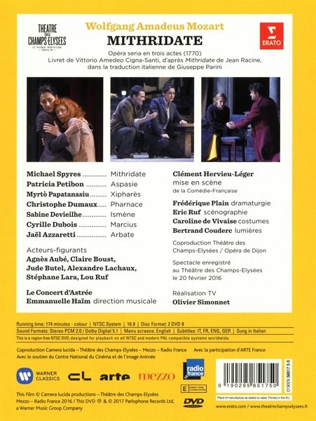 Das Werk stammt zwar vom größten Klassiker überhaupt, gilt aber immer noch als Geheimtipp: 14 Jahre alt war Mozart, als er für das äußerst verwöhnte Mailänder Publikum die Oper Mitridate, re di Ponto schrieb. In der Inszenierung von Clément Hervieu-Léger und musikalisch geleitet von Emmanuelle Haïm war Mozarts geniales Frühwerk 2016 das absolute Highlight der Saison im Pariser Théâtre du Champs Elysées. Jetzt erscheint die gefeierte Produktion auf DVD. Michael Spyres, Patricia Petibon, Sabine Devieilhe: Es sind prominente Namen, die hier zum Ensemble vereint sind und ein völlig zu Unrecht unterschätztes Werk präsentieren. Der früh zur Meisterschaft gereifte Mozart zeigt sich hier als Opern-Experimentator: "Keine der über 20 Arien ähnelt sich formal. Er setzt einen deutlichen Akzent auf die große dramatische Entwicklung", erklärt Emmanuelle Haïm. Das geht Hand in Hand mit psychologischer Tiefe in der Figurenzeichnung - zuallererst natürlich bei Mitridate selbst: Der persische Tyrann stellt mit dem Gerücht seines Todes seine Verlobte Aspasia und seine Söhne auf die Probe, und alle verwickeln sich in einem Geflecht aus Liebe und Verrat. In der Rolle der Ismene glänzt Sabine Devieilhe, die hier an ihr Mozart-Album The Weber Sisters anknüpft. Der Regisseur Clément Hervieu-Léger, Resident Director an der renommierten Comédie Française, überträgt die antike Handlung in eine moderne aber schlüssige Szenerie.