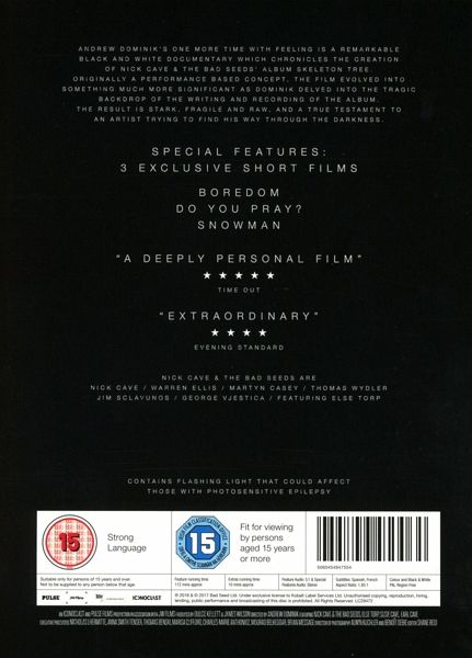 "One More Time With Feeling" - visuell einmalig - ein Film über die Entstehung ihres umjubelten Albums "Skeleton Tree", bei dem Andrew Dominik (Chopper, The Assassination of Jesse James by the Coward Robert Ford) Regie führte, ist eine karge, fragile und raue Dokumentation. Gedreht in 3D, Farbe und schwarz-weiß, erforscht der Film die verborgenen persönlichen Gegebenheiten, welche die Entstehung von "Skeleton Tree" (Nick Cave & The Bad Seeds' 16. Studio-Album) umgeben und beinhaltet Live-Auftritte der Band im Studio. Ursprünglich als eine einmalige Kinovorführung vorgesehen - mit einem weltweiten Filmstart am 8. September in über 950 Kinos und 30 Ländern - kehrte "One More Time With Feeling", aufgrund der überwältigenden Nachfrage, im Dezember für weitere Vorführungen auf die große Leinwand zurück. - "One More Time With Feeling" wird nun auf DVD, Blu-ray und Limited Edition 3D Blu-Ray veröffentlicht. Alle Formate erscheinen als 2 Disc-Set inkl. bislang ungesehenem Material. Stimmen: "Film of The Year" - MOJO "Extraordinary" - Evening Standard "A deeply personal film" - Time Out "An undeniably moving contemplation of shattering loss¿a tremendously moving collage." - The Guardian ""One More Time With Feeling" [...], entlässt den Zuschauer jedoch bei aller Betrübnis mit dem Gefühl, dem Menschen Nick Cave sehr nah gekommen zu sein." - Spiegel Online