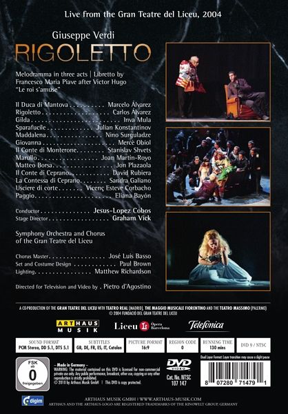 Rigoletto zählt zu einer der populärsten Opern von Verdi, deren Libretto auf das Drama Le roi s'amuse von Victor Hugo basiert. Nachdem das Werk nach der Uraufführung in Venedig verboten wurde, weil es den König als zynischen Lebemann darstellt, wurde die Handlung an einen Renaissancehof verlegt. Der bucklige Hofnarr des Herzogs von Mantua wird schließlich zur Titelfigur in Verdis Oper. Die Aufführung aus dem Gran Teatre del Liceu 2004 wird vom spanischen Dirigenten Jesus-Lopez Cobos geleitet. Graham Vicks Inszenierung sowie Paul Browns Bühnenbild und Kostüme weichen von der realistischen Bildwelt ab, nichts wird offensichtlich dargestellt. Der Hofnarrenthron wird beispielsweise in Form eines komfortablen Lederlehnstuhls präsentiert, von dem aus der Protagonist manchmal stolz, manchmal am Boden zerstört waltet. Auch der prunkvolle Renaissance-Palast des Herzogs weicht einem antiseptischen Raum, in dem die Frauen wie in einem Schaufenster gezeigt werden und der Herzog sich je nach Belieben eine aussuchen kann.