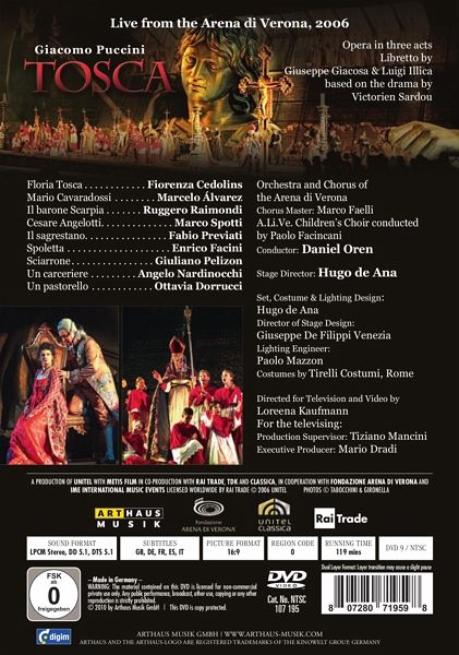 A superlative staging of Puccini's Tosca by Italian opera producer Hugo de Ana brought to you from the world-famous Arena di Verona and complete with all the splendour that a Puccini opera demands! The popular tragedy is sung by a dream team cast of excellent singer-actors and conducted by long-established Arena di Verona conductor Daniel Oren. The recording captures one of those special Verona summer evenings, when the audience fills the historic circle in expectation of the enjoyment of an open-air opera performance. Verona's amphitheatre, known as the 'arena', provides an atmospheric setting for the summer festival. To view an opera in the former amphitheatre, the second largest of its kind after the Colosseum in Rome, can truly be regarded as an impressive experience. The DVD, however, provides a closer look at the stage and the singers and brings this dramatic opera directly to the home viewer.
