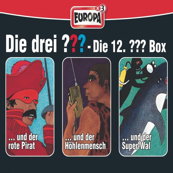 3er-Box: Folge 34: Die drei ??? und der rote Pirat. Wer verbirgt sich hinter der Maske des "roten Piraten" - und warum bedroht er Justus, Bob und Peter? Wer steckt hinter den Tonbandinterviews von Major Karnes - und wonach gräbt dieser heimlich in der Piratenbucht? Die drei ??? lassen nicht locker, bis sie das Rätsel um den legendären Piratenschatz gelöst haben - einen Schatz an dem allerdings einiges mehr als faul ist. Folge 35: Die drei ??? und der Höhlenmensch. Seit in Citrus Grove ein vorgeschichtliches Skelett eines Menschen gefunden wurde, passieren seltsame Dinge... Zigeuner-John, der vor dem Museum Wache hält, behauptet sogar, er habe in der Nacht den lebendig gewordenen Höhlenmenschen weglaufen sehen! Neugierig und ahnungsvoll machen sich die drei ??? ans Beobachten... Folge 36: Die drei ??? und der Super-Wal. Ein gestrandeter Wal ist im privaten Schwimmbecken eines gewissen Mr. Slater untergebracht und wird dort von Constance abgerichtet, um mit seiner Hilfe das gesunkene Boot ihres Vaters aufzuspüren. Warum will ein Fremder Salters und Constances Vorhaben vereiteln? Weiß er eventuell von der wichtigen Aufgabe des klugen Wals - des Super-Wals?