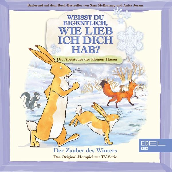 Der Zauber des Winters Über Nacht hat eine weitere dicke Schicht Schnee die Wiese in ein frisches weißes Kleid gehüllt. Der kleine braune Hase fragt den großen braunen Hasen wie lange der Schnee noch liegen bleiben wird. Denn der Schnee ist zwar schön, aber der kleine braune Hase vermisst die Dinge, die ihm in anderen Jahreszeiten so viel Freude bereiten – das Gezwitscher von Blauvogels Kindern im Frühling, die saftigen Gräser des Sommers und das prachtvolle bunte Herbstlaub. Der große braune Hase erklärt ihm, dass auch der Winter seinen Zauber hat und voller Überraschungen steckt. Man muss nur die Augen und Ohren aufmachen, um sie zu entdecken. Also machen sich die beiden zusammen auf die Suche. Ein neuer Freund An diesem Tag entdeckt der kleine braune Hase ungewöhnliche Spuren im Schnee. Der große braune Hase erklärt ihm, dass sie von einem Rehkitz stammen. Es lugt auch kurz hinter einem Baum hervor, aber es verschwindet sofort wieder. Kleine braune Rehe sind nämlich sehr scheu. Der kleine braune Hase hätte gerne einen neuen Freund, denn es vermisst seine Freunde, die den Winter in wärmeren Gefilden verbringen oder verschlafen. Der große braune Hase erklärt ihm, dass er das scheue kleine Reh kennenlernen könnte, wenn er sich ihm vorsichtig nähert und sein Vertrauen gewinnt. Gemeinsam mit der kleinen Feldmaus macht sich der kleine braune Hase auf die Suche nach dem kleinen Reh. Die Schnee-Tiere Über Nacht ist im Tal sehr viel Schnee gefallen und die Wiese ist unter einer dicken Schneedecke verschwunden. Der Schnee ist so tief, dass man kaum laufen kann. Deshalb entscheidet der große braune Hase alleine auf die Suche nach Nahrung zu gehen. Er bringt den kleinen braunen Hasen von ihrem Schlafplatz im hohlen Baum unter die große Eiche. Dort ist der Schnee nicht ganz so tief und der kleine Hase kann sich mit Spielen die Zeit vertreiben bis der große braune Hase zurück ist. Eis laufen Die Freunde des kleinen braunen Hasen vertreiben sich den Tag mit Eis laufen auf dem zugefrorenen See. Aber der kleine braune Hase ist noch nie auf dem Eis gelaufen und seine ersten Versuche enden mit einem komischen Ausrutscher. Das finden zumindest seine Freunde. Er selbst denkt, dass sie ihn auslachen und läuft schnell zurück zum großen braunen Hasen. Bekümmert erzählt er ihm was passiert ist.