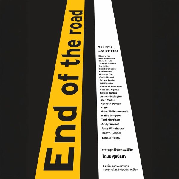 End of the Road ฉากสุดท้ายของชีวิตเล่มนี้ รวบรวม 25 เรื่องเล่าก่อนความตาย ของบุคคลในหน้าประวัติศาสตร์โลก ความเรียงคัดสรรจากเว็บไซต์ "The Matter" หนังสือเล่มนี้จะชวนคุณสำรวจชีวิตในยามสุดท้ายของเหล่าบุคคลผู้จากไป หากเรื่องราวยังคงอยู่ และควรค่าแก่การรับรู้ ทั้งนักร้อง-นักแสดงชื่อดัง นักประดิษฐ์ที่มีชื่อเสียง และอีกสารพัดบุคคลในหน้าประวัติศาสตร์ ไม่ว่าจะเป็น สตีฟ จอบส์, นีล อาร์มสตรอง, ฮีธ เลดเจอร์, ชาร์ลี แชปลิน, แอนดี วอร์ฮอล, นิโคลา เทสลา ไปจนถึง เพลโต ถ่ายทอดเรื่องราวโดย "โตมร ศุขปรีชา" นักเล่าเรื่องและบรรณาธิการที่มองหาบทสรุปในชีวิตที่จบลง...