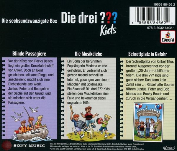 3x Hörspiel-Spaß mir den drei ??? Kids, Folge 76-78 - Blinde Passagiere - Die Musikdiebe - Schrottplatz in Gefahr Drei spannende Abenteuer der drei Detektive! Folge 76 / Blinde Passagiere Vor der Küste von Rocky Beach liegt ein großes Kreuzfahrtschiff vor Anker. Doch an Bord geschehen seltsame Dinge und anscheinend macht sich eine Diebesbande ans Werk. Justus, Peter und Bob gehen der Sache auf den Grund und sie mischen sich unter die Passagiere. Folge 77 / Die Musikdiebe Aus dem Tonstudio des Popstars Modena wurde ein Song gestohlen. Kann Modena ihrem Team nicht mehr vertrauen? Als Chorsänger getarnt begeben sich die drei ??? Kids auf die Spur des Diebes. Folge 78 / Schrottplatz in Gefahr Der Schrottplatz von Onkel Titus brennt! Ausgerechnet vor der großen ť20-Jahre-JubiläumsfeierŤ. Die drei ??? Kids sind ganz sicher: das kann kein Zufall sein ... Rätselhafte Spuren führen Justus, Peter und Bob hinaus aus Rocky Beach und weit zurück in die Vergangenheit ...