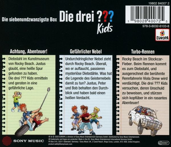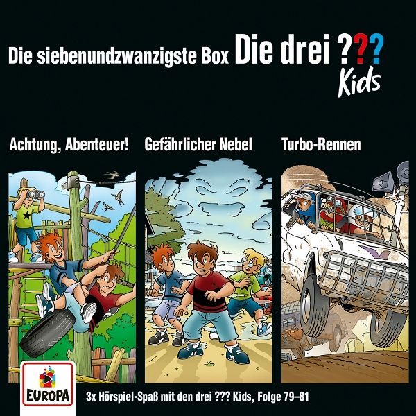 79 ACHTUNG, ABENTEUER! Diebstahl im Kunstmuseum von Rocky Beach. Justus glaubt, eine heiße Spur gefunden zu haben. Die drei ??? Kids ermitteln und geraten in eine gefährliche Lage. 80 GEFÄHRLICHER NEBEL Undurchdringlicher Nebel zieht durch Rocky Beach. Überall, wo er auftaucht, passieren mysteriöse Diebstähle. Was hat die Legende des Geisternebels damit zu tun? Justus, Peter und Bob behalten den Durchblick und haben bald einen heißen Verdacht. 81 TURBO-RENNEN Rocky Beach im Stockcar-Fieber. Beim Rennen kommt es zum Diebstahl, und ausgerechnet die berühmte Rennfahrerin Viola Drew wird verdächtigt. Die drei ??? Kids versuchen, deren Unschuld zu beweisen, und stürzen sich kopfüber in ein rasantes Abenteuer!