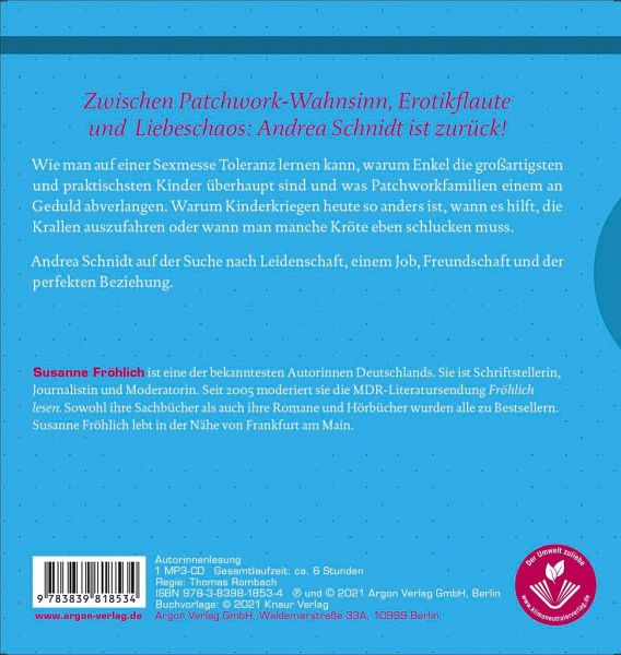 Die humorvollen Romane um Andrea Schnidt von Bestseller-Autorin Susanne Fröhlich sind in folgender Reihenfolge erschienen: Frisch gepresst, Frisch gemacht!, Familienpackung, Treuepunkte, Lieblingsstücke, Lackschaden, Aufgebügelt, Wundertüte, Feuerprobe, Verzogen