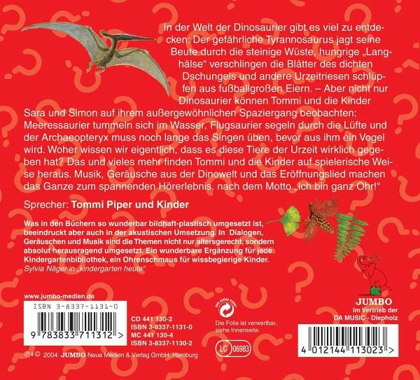 In der Welt der Dinosaurier gibt es viel zu entdecken: Der gefährliche Tyrannosaurus jagt seine Beute durch die Wüste, hungrige Langhälse verschlingen die Blätter des Dschungels und andere Urzeitriesen schlüpfen aus fußballgroßen Eiern. Aber nicht nur Dinosaurier können Tommi und die Kinder Sara und Simon auf ihrem außergewöhnlichen Spaziergang beobachten: Meeressaurier tummeln sich im Wasser, Flugsaurier segeln durch die Lüfte und der Archaeopteryx muss noch lange das Singen üben, bevor aus ihm ein Vogel wird. Woher wissen wir eigentlich, dass es diese Tiere der Urzeit wirklich gegeben hat? Das und vieles mehr finden Tommi und die Kinder auf spielerische Weise heraus.