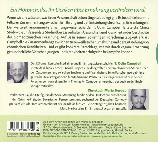 Der US-amerikanische Mediziner und Ernährungswissenschaftler T. Colin Campbell leitete das China-Cornell-Oxford-Project, eine der größten epidemiologischen Studien über den Zusammenhang zwischen Ernährung und Krankheiten. Seine Forschungsergebnisse gelten heute als wegweisend für Medizin und Politik. Christoph Maria Herbst verkörperte u.a. die Titelfigur in der Serie Stromberg, für die er den Deutschen Fernsehpreis, den Grimme-Preis, den Bayerischen Fernsehpreis und siebenmal den Deutschen Comedypreis erhielt. Als Hörbuchsprecher ist er eine Klasse für sich.