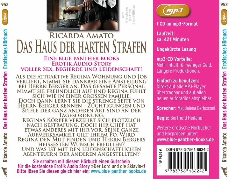 Als die attraktive Regina Wohnung und Job verliert, nimmt sie dankbar eine Anstellung bei Herrn Berger an. Das gesamte Personal nimmt sie freundlich auf und Regina fühlt sich wie in einer großen Familie. Doch dann lernt sie die strenge Seite von Herrn Berger kennen - Züchtigungen und Spiele der ganz anderen Art sind an der Tagesordnung.Reginas Körper verzehrt sich plötzlich nach Bestrafung, doch ihr Chef hat etwas anderes mit ihr vor. Seine ganze Aufmerksamkeit gilt ihrem Po. Wird Regina den Mut finden und Herrn Bergers heißesten Wunsch erfüllen? Und was ist mit den leidenschaftlichen Abenteuern der anderen Angestellten?Gelesen von Magdalena BerlusconiRegie: Berthold HeilandUngekürzte LesungSpielzeit: 421 MinutenDiese Ausgabe ist vollständig, unzensiert und enthält keine gekürzten erotischen Szenen.